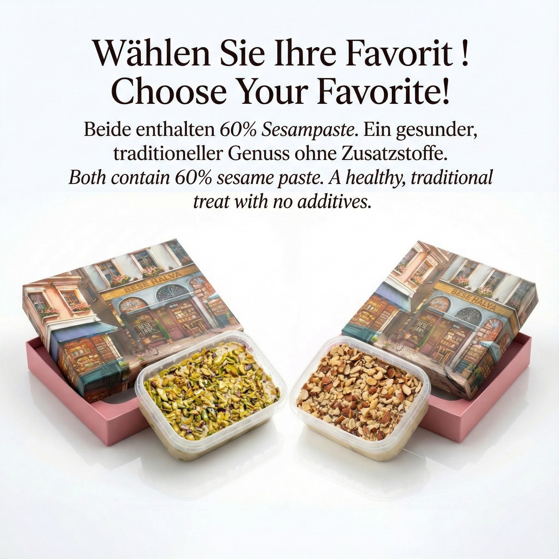 - Four varieties to choose from: Classic (Natural) for pure halva flavor, Cocoa with a delicate cocoa note, Dark Chocolate for an intense chocolate option, and Antep Pistachio with aromatic pistachio pieces – simply select your desired variety.