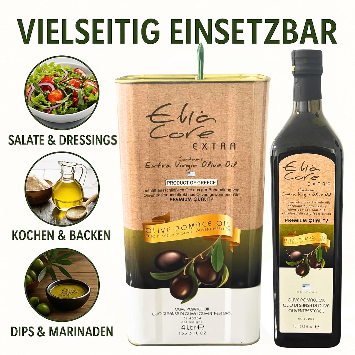 - 🫒 100 % aus Oliven hergestellt – Dieses Öl wird ausschließlich aus Oliven gewonnen und enthält keine anderen Pflanzenöle. Ein reines und sicheres Produkt.